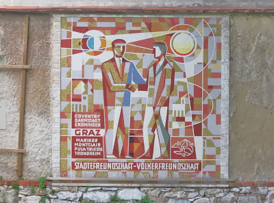 2. Walk all the way through the tunnel that provides access to the Dom im Berg performance venue deep in the mountain, emerge at the other end, and then hike up the paved road that winds its way up in sharp curves through the wooded part of Schlossberg on the East side. The tunnel is sloped upward slightly, and the road is rather steep.